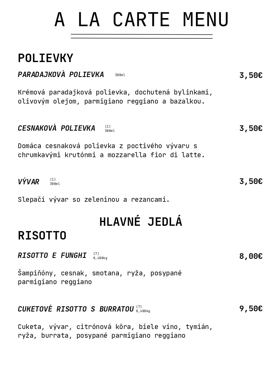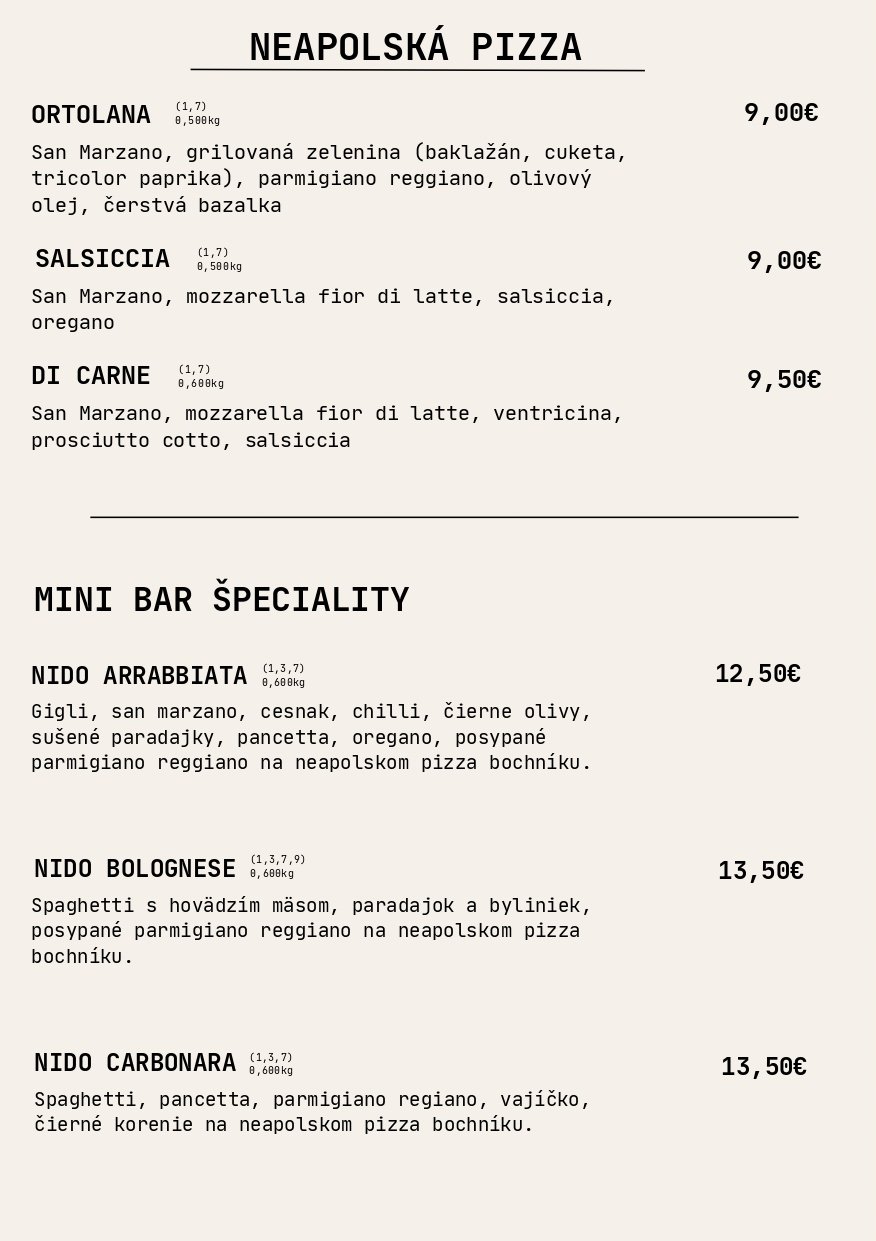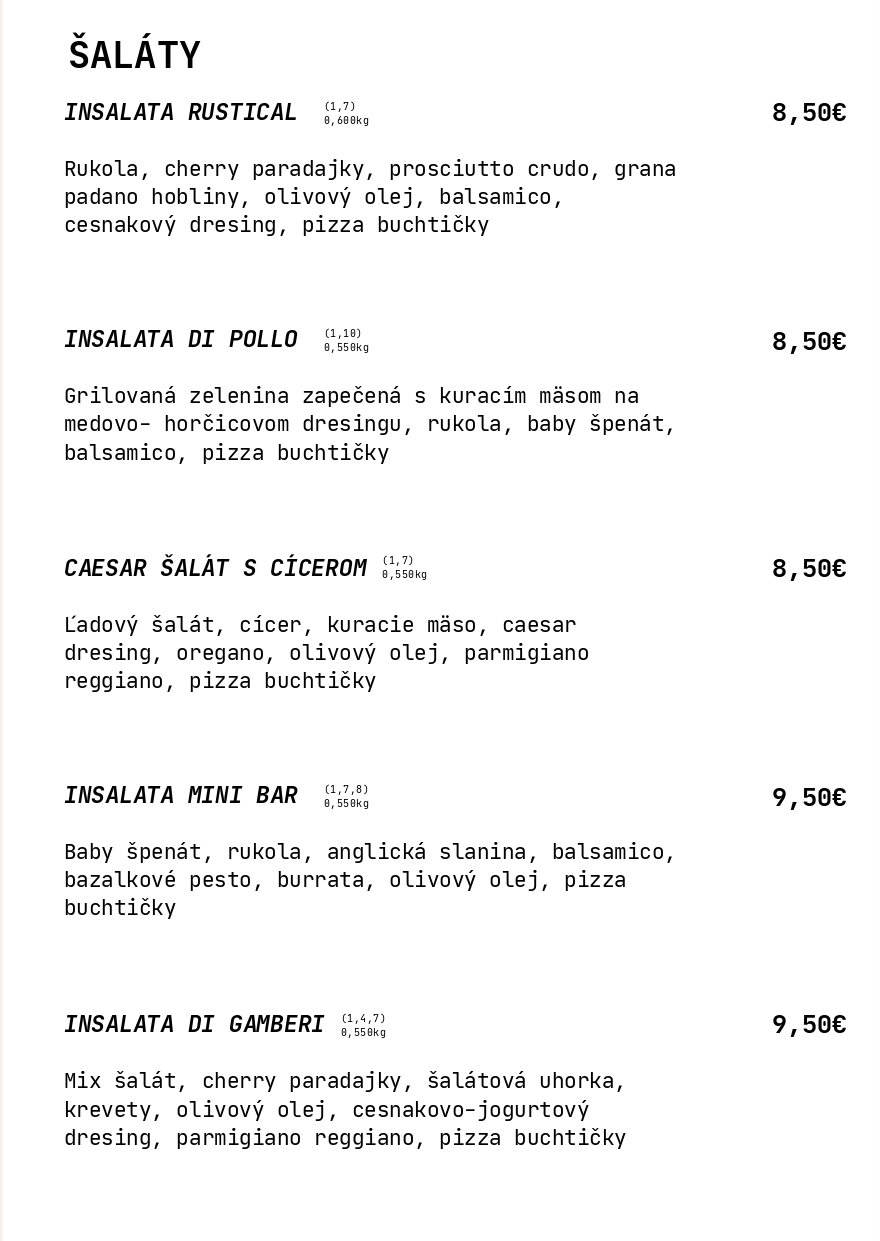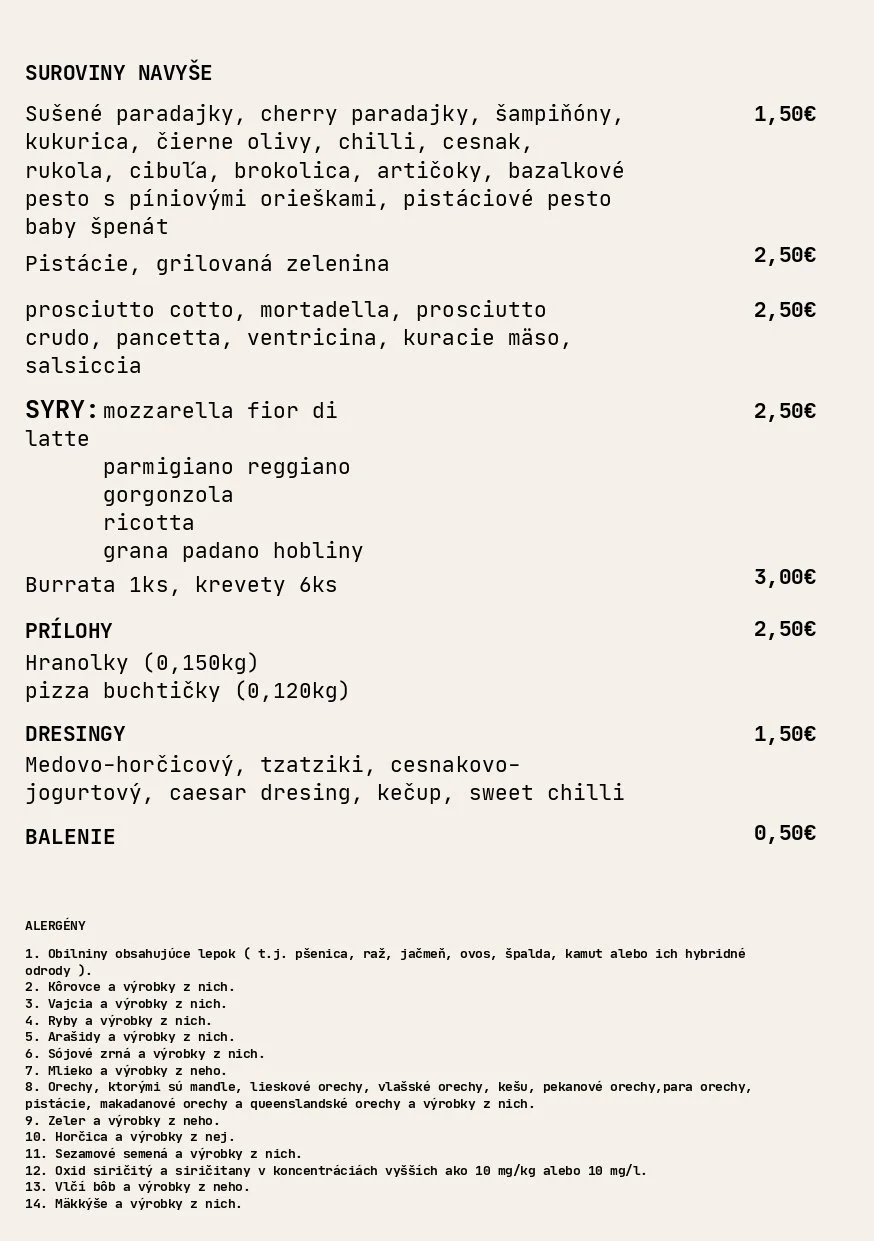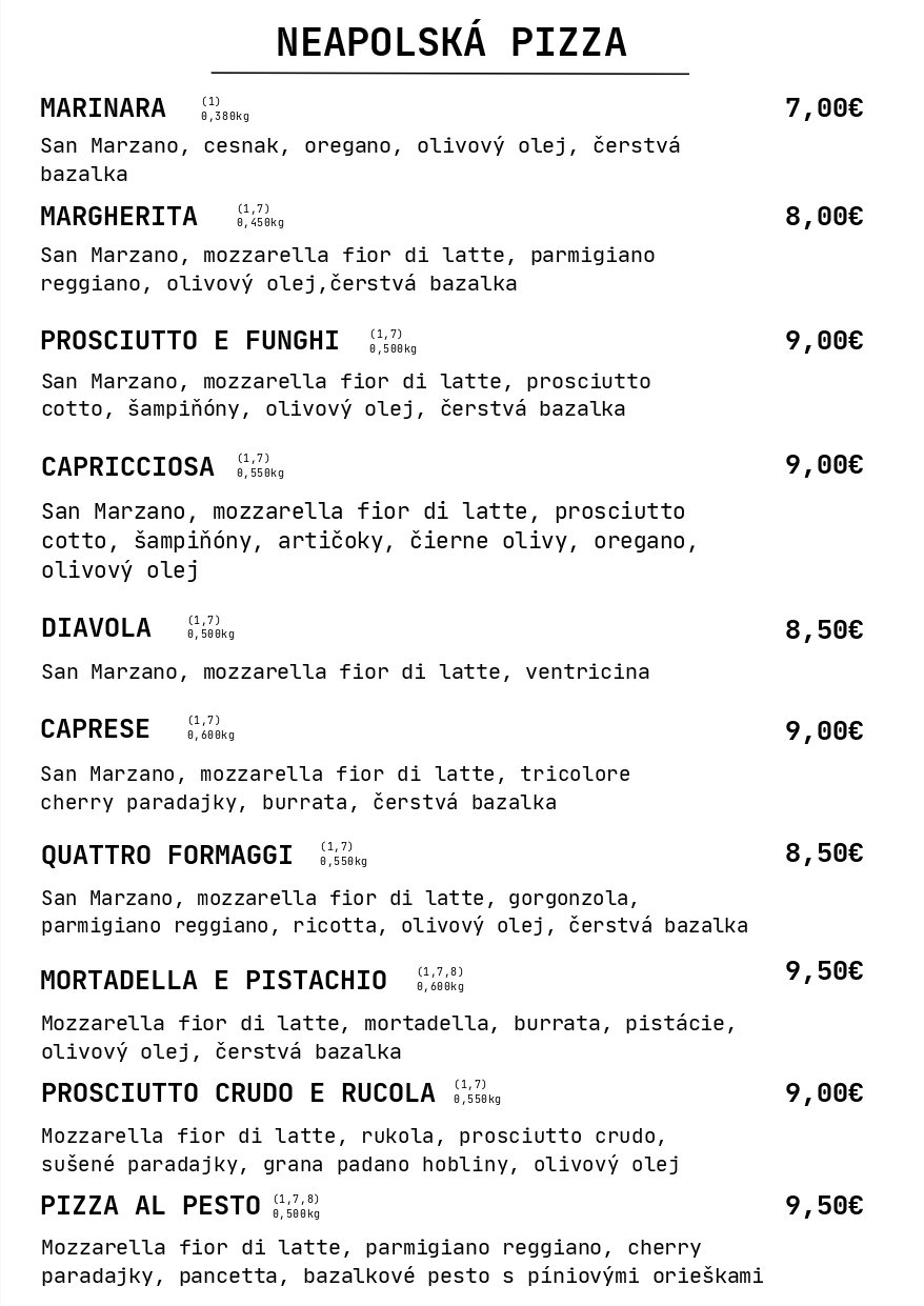 V našej novootvorenej kuchyni pre vás s láskou pripravujeme v peci pečenú pravú neapolskú pizzu. Každý kúsok vzniká podľa originálnej talianskej receptúry z kvalitných talianskych surovín – od jemného cesta, ktoré dozrieva niekoľko hodín, až po chuťovo vyvážený paradajkový základ a pravú mozzarellu.